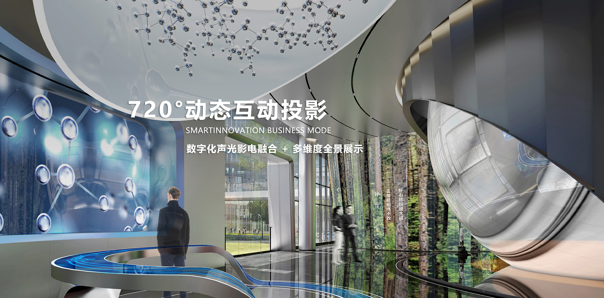 數(shù)字信息時代,華竣數(shù)創(chuàng)運用燈光秀、超清視頻、特種影院等新媒體視覺藝術(shù)的聲光影電炫酷效果調(diào)動觀者的所有感官全身心參與展廳視聽體驗,享受沉浸式心流狀態(tài)。